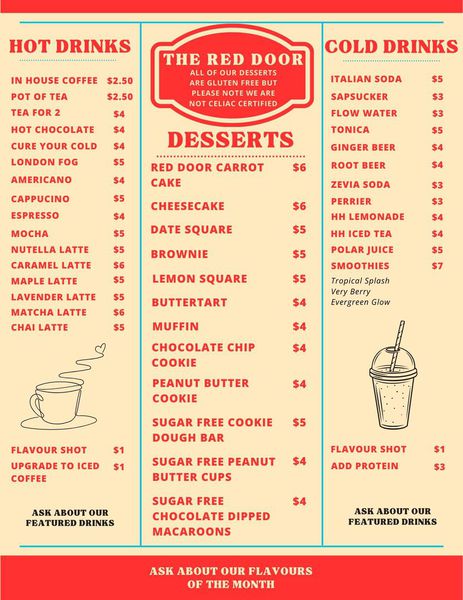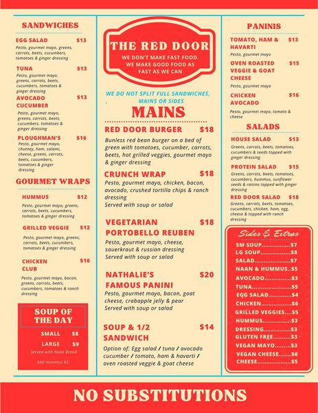 you have a seating preference, or for group bookings. Calling ahead and ordering to-go is also an option! Our daily special and soup are posted to our Instasgram and Facebook @thereddoorfergus.